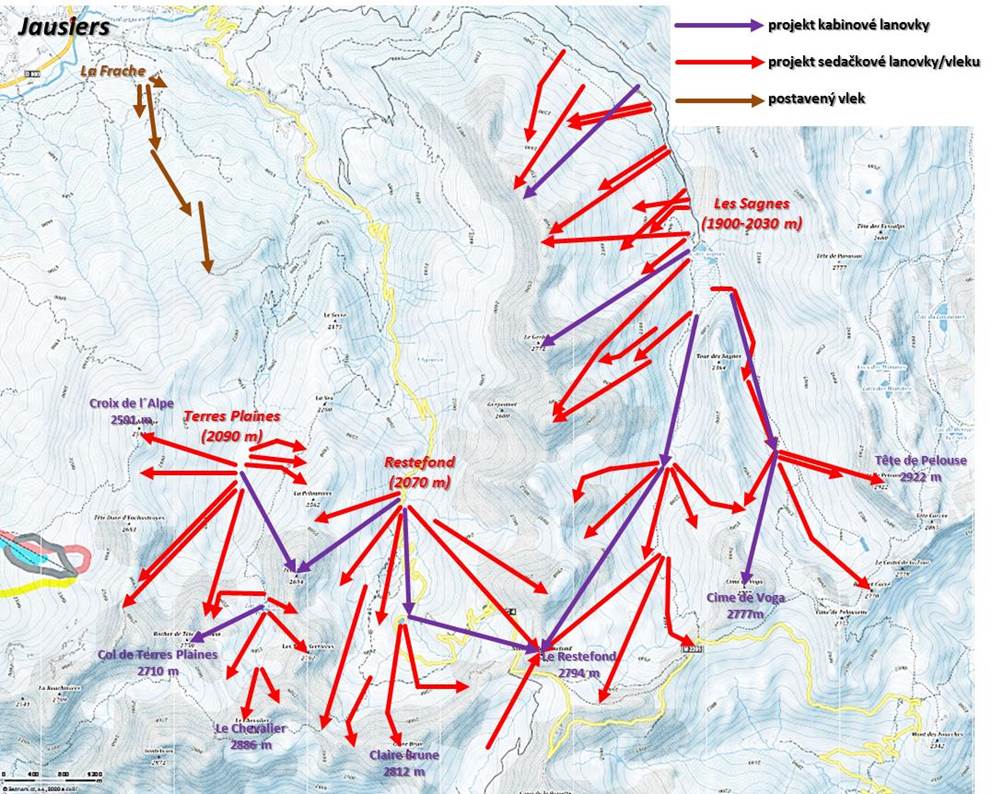 Na rozdíl od jiných francouzských megastředisek zůstal jen na papíře projekt Restefond u Jausiers v údolí Ubaye. Celkem 25 000 lyžařů zde mělo být ubytováno, aby využívali přes šedesát dopravních zařízení obsluhujících sjezdové tratě v nadmořské výšce 1900 – 2900 m. Nabízelo se i propojení se sousedním střediskem La Sauze. Realizace se nakonec dočkal až v roce 1982 jen malý areál La Frache poblíž obce se třemi na sebe navazujícími vleky od Pomy a 10 km sjezdových tratí. Pro ztrátovost a problémy s dodávkou elektřiny (nejvýše položený vlek vůbec nebyl v provozu) byl provoz střediska po 13 letech ukončen a vleky rozprodány do okolních areálů. Podle panoramatické mapy jsem se pokusil vyznačit polohu projektovaných vleků a lanovek.