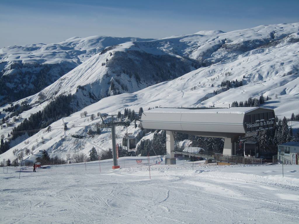 16-MGD Ruelle (Poma, 2000), vede z vesnice Hauteluce, kabiny mají mezi sebou poměrně velké intervaly a ve stanici vždy na nějakou dobu úplně zastaví
