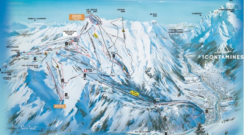 Les Contamines. Jedná se o menší středisko, ve kterém je "pouze" 120 km sjezdovek. Do střediska jsem si udělal výlet během týdenního pobytu v oblasti Evasion Mont-Blanc (Megéve, Combloux, Saint-Gervais), do které Les Contamines také patří a tudíž zde platí i skipas. Středisko je z hlediska dopravy dobře dostupné, do Ženevy je to pouze 75 km (většina po dálnici), propojení se zbytkem oblasti Evasion Mont-Blanc je zajištěno skibusy, popřípadě místními linkovými autobusy (3,50 EUR jedna jízda). Středisko leží bezprostředně pod masivem Mont-Blancu. Vzhledem k poloze většiny sjezdovek ve výškách okolo 2000 m.n.m. zde nejsou výraznější problémy s nedostatkem sněhu. Pokud k tomu přidám úžasné počasí, které v době mé návštěvy panovalo, a také minimum lidí na sjezdovkách nelze se divit, že jsem si jednodenní pobyt v Les Contamines náležitě užil, lyžování bylo opravdu úžasné.
