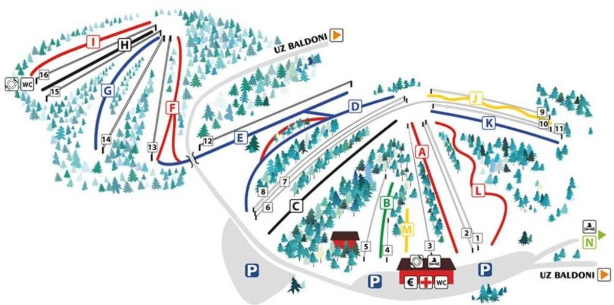 lyžařské středisko Riekstukalns. První pohled na jeho panoramatickou mapu možná naznačuje
