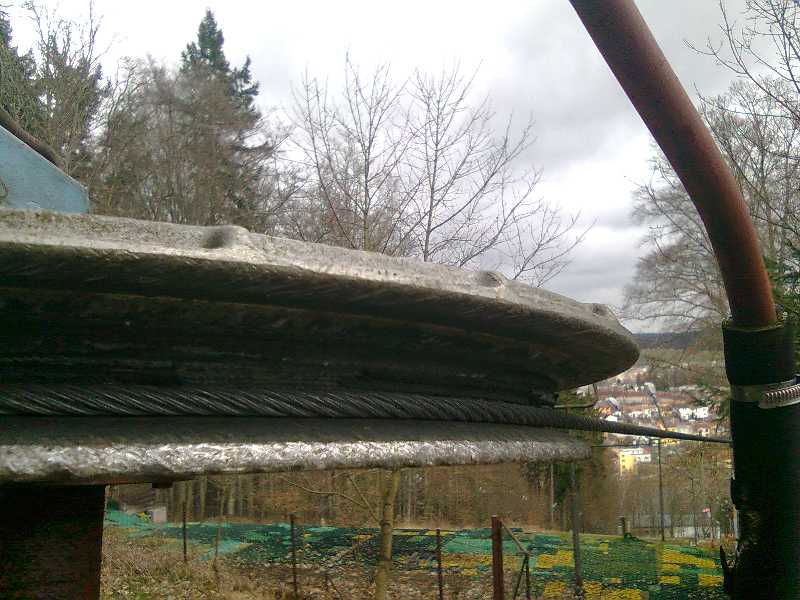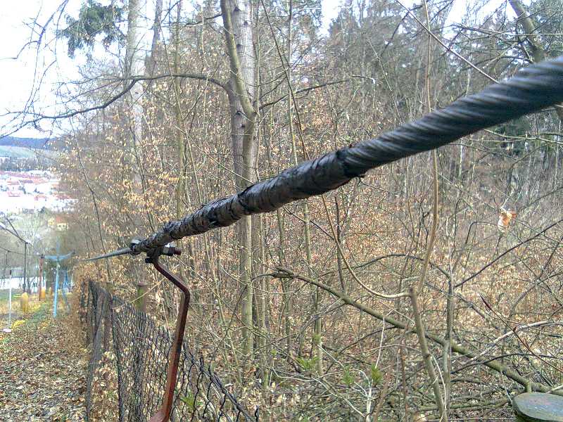 Poznámka: Na vratné větvi u předposlední podpěry chybí kladková baterie (zcizena či uhnila), lano je prověšené, unašeče se courají po zemi
